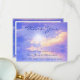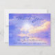 Sol brilhante espiando nuvens azuis e rosa. A linha do horizonte se mistura em água tranquila, onde o nome e as datas de seu amado residem. Na parte de trás do cartão lê-se: Obrigado por pensar na nossa família durante este período difícil. Apreciamos profundamente a sua manifestação de simpatia.