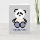 Um cartões de agradecimentos com ilustração na frente de um urso panda com patas e orelhas de gingham azuis. O texto diz "Obrigado!" Dentro é vazio.