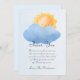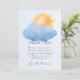 Pequeno cartões de agradecimentos de sol bonito com ilustração de nuvens e céu azul. A mensagem obrigado convidados para vir ao chá.