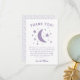 Diga "obrigado" aos seus convidados chás de fraldas com esta doce lua de pelúcia e cartão de estrelas. O cartão já tem textos (eles são editáveis) para facilitar a sua vida. Este design é de lavanda.
