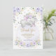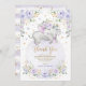 Cartões de agradecimentos feminina e na moda com um adorável elefante adormecido, deitado numa lua de lavanda pastel, elegantes flores roxas e verde botânico mole. Clique no botão "personalizar mais" se quiser reorganizar e formatar o estilo e a posição do texto. Vem com uma faixa roxa e dourada correspondente na parte de trás.