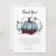 O obrigado elegante e rústico de chá de fraldas, com uma ilustração de uma abóbora azul com falso brilho prateado e flores de burgundy. A mensagem obrigado os convidados por virem ao chá e pelo presente. Personalize este produto adicionando seu nome na parte inferior. O tema do outono perfeito design para um bebê.