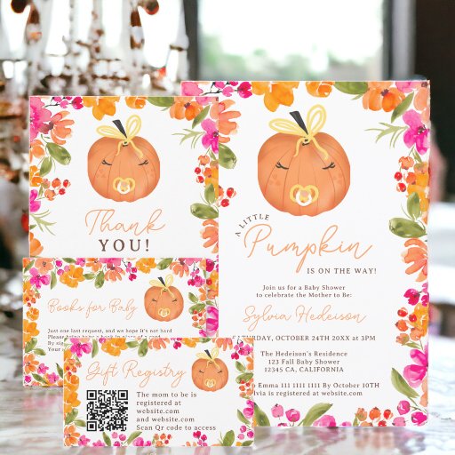 Um pouco de abóbora está a caminho! Celebre seu chá de fraldas neste outono, uma abóbora de bebê laranja, no outono, com um pacificador e uma estrutura de aquarela floral com flores rosa e laranja brilhantes obrigado seu chá de fraldas.