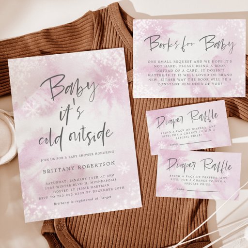 Bebê elegante e moderno é frio fora do tema cartões de agradecimentos de chá de fraldas de menina apresentando ilustração de flocos de neve brancos brilhantes em um fundo de aquarela rosa. A mensagem obrigado hóspedes por vir ao chá e pelos presentes.