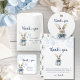 Este cartões de agradecimentos é o toque final perfeito para o seu chá de fraldas. Apresentando flores azuis e um belo coelho em um Arco azul.