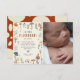 Deixe amigos e familiares saberem que seu pequeno cogumelo chegou com esse chá de fraldas de cogumelo branco. Obrigado Cartões! Design apresenta uma fotografia do seu bebê recém-nascido, cogumelos selvagens, folhagem e ilustrações da floresta pintadas manualmente com aquarela.