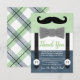 Este cartões de agradecimentos de chá de fraldas apresenta um tema de homem com um bigode, suspensórios e gravata de arco e uma xadrez na parte de trás em verde, azul marinho e preto. Convidado e decorações correspondentes disponíveis em loja.