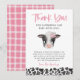 Cartões de agradecimentos de chá de fraldas de uma menina, bonito e rústico, com tema de fazenda, com ilustração de uma vaca bebê com flor rosa. A mensagem obrigado hóspedes por vir ao chá e pelos presentes.