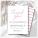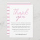 Esse cartões de agradecimentos elegante e contemporâneo foi projetado para um chá de fraldas. A frente exibe uma inscrição cor-de-rosa contra um fundo branco nítido, enquanto a parte inversa apresenta um delicado padrão rosa pastel e listra branca. Com a sua design limpa e moderna, esta carta serve como a canvas perfeita para uma personalização fácil, permitindo-lhe transmitir a sua gratidão de uma forma atenciosa e na moda.