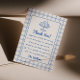 Como podem ver, este chá de fraldas, obrigado, as cartas mostram o bebê no tema azul-forno. Com placa de patisseries desenhada à mão e checkboards de gingham com um roteiro escrito à mão do obrigado que você e o obrigado que você coloca no modelo. Com sobrenome familiar no fundo. Todo esse modelo de design é facilmente personalizável clicando no botão de personalização.