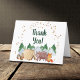 Cartões de agradecimentos dobrado de chá de fraldas russo com ilustração aquosa de animais da floresta com suas tendas acampadas nas montanhas e na floresta, uma camada de estrelas de ouro e "Obrigado" em um roteiro verde de caçador escuro. No dentro, adicione seu obrigado personalizado e seus nomes em um script verde caçador de assinaturas.