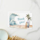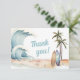 Cartões de agradecimentos bonito para os convidados chás de fraldas, com a ilustração aquática de uma cena de praia tropical com ondas de ruptura, palmeiras, praias arenosas, estrelas e pranchas, e "Obrigado!" mostrado em um divertido roteiro azul. No verso, personalize o seu obrigado, envie uma mensagem ou deixe o vazio para uma nota manuscrita.