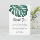 Cartões de agradecimentos temático tropical simples com ilustração de uma folha de monstera verde. O texto padrão obrigado os convidados para a celebração e o presente. Personalize este produto adicionando seu nome na parte inferior. Design neutro em termos de gênero.