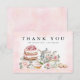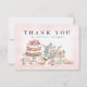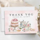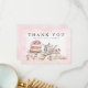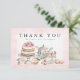Envie agradecimentos sinceros com este elegante cartão de agradecimento para chá de panela. Com uma ilustração em aquarela de um bule de chá floral vintage, bolo em camadas, xícara de chá e pastelarias doces, este design rosa e dourado é perfeito para uma celebração de casamento romântica ou estilo jardim. Personalize com o nome da noiva ou "a futura Sra." para um acabamento atencioso e personalizado.