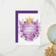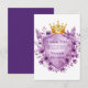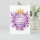 Este requintado modelo de convite de casamento apresenta uma coroa dourada real adornada com joias de ametista, aninhada acima de um escudo heráldico emoldurado a ouro. Ao redor do desenho estão peônias roxas e lavandas exuberantes, criando um motivo floral luxuoso e vintage. Perfeito para casamentos românticos com tema real ou celebrações elegantes com um toque de nobreza e charme floral. O escudo em branco fornece espaço para nomes personalizados, datas ou mensagens.