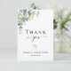 Um cartões de agradecimentos moderno e elegante. Um fundo branco chic. Decorados com folhas de eucalipto, prigos, verde e ouro de cor aquosa verde. Texto preto. Na frente do texto: Obrigado, nome e data. Back: Modelo para sua nota de agradecimento e seu nome.