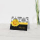 Elegante cartão de nota de agradecimento feito em um padrão de damasco preto e branco, na parte superior da frente e fundo preto sólido, na parte inferior. Gráficos de uma fita grosgrain amarela, com uma rosa amarela, decora a frente do cartão. Texto em uma escrita cinza escuro, no interior, e rosa na frente, está pronto para personalizar de acordo com as suas necessidades. Uma maneira encantadora de enviar seus agradecimentos após o casamento ou outras ocasiões especiais.