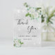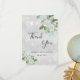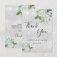 Um cartão de agradecimento para Chuva de Presentes de Casamento. Uma cor de fundo metálica prateada falsa. Decorado com flores brancas, folhagens e poeira cintilante falsa. Na frente, uma grande letra manuscrita e o texto: Obrigado, seu texto, título e data. Costas: personalize e adicione sua nota de agradecimento e nome.