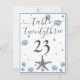 Cinza Starfish Blue Shells Beach Wedding Table Number Card. Dois corações na areia, fundo azul escuro