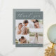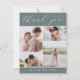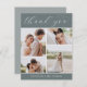 O casamento elegante agradece-vos que as cartas contêm quatro fotografias organizadas num esquema de colagem em grelha num fundo verde-escuro empoeirado. "Obrigado" aparece no topo na escrita de caligrafia, com seus nomes na parte inferior em caracteres clássicos de blocos. Adicione uma mensagem pessoal e uma assinatura ao verso.