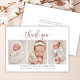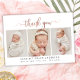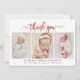 Moderno Elegante Rosa Chic Dourado Script 3 Foto Colagem Recém-Nascido Bebê Obrigado Cartão de Anúncio de Nascimento. Apresenta um bonito texto "obrigado você" em uma letra maiúscula, caligrafia escrita à mão, robusta e roxa, cor-de-rosa-rosa, com um script de película FAUX sobre fundo branco. Estão incluídas as estatísticas pré-feitas de mensagens pessoais e natalidade com o nome do bebê. Excelente para a menina. Fácil de personalizar com sua foto de bebê e detalhes.