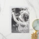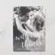 Um cartões de agradecimentos de casamento moderno projetado para acomodar sua foto de casamento vertical ou orientada a retratos favoritos de sangramento de cheio. "Com nossos obrigados" aparece na parte inferior como uma cobertura de texto de roteiro de caligrafia branca, com seus nomes e data de casamento abaixo. Adicione uma mensagem opcional à parte de trás com padrão sutil usando os campos fornecidos ou exclua o texto de amostra para adicionar sua própria mensagem manuscrita de obrigados.