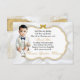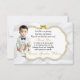 Belo bebê de terno branco e de ouro. O fundo do convite é uma placa branca com uma estrutura dourada e cintilante prateada e um embelezamento do arco. A parte de trás é enfeitada com padrão de flores douradas e fita dourada sobre fundo branco de cetim.