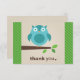 Coruja azul nos cartões de nota "Obrigado". Escreva sua nota pessoal de agradecimento na parte de trás do cartão. As cores incluem azul-turquesa, verde, castanho-chocolate, esticado e azul-pó.