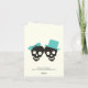 Convite de casamento elegante de Halloween com caveira de turquesa, apresentando um casal de caveiras preto noivo e noiva em fundo marfim e uma borda com padrão de caveira. O noivo usa um chapéu azul turquesa e a noiva um laço azul turquesa.