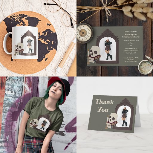 Adicione uma estética acadêmica escura ao seu obrigado de graduação com este cartão personalizável. Apresenta uma ilustração de um crânio, uma vela num castiçal, alguns livros antigos e um quadro de ornamentado contra um fundo verde-cinza escuro. Sua foto aparece dentro do quadro do ornamentado. Estas placas estão na vazio para escrever a sua própria mensagem de obrigados.