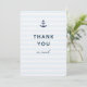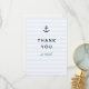 Este modelo de cartão de agradecimento exclusivo com tema náutico é perfeito para agradecer a convidados e bem-intencionados em diversas ocasiões, incluindo casamentos, nascimentos, aposentadorias e outros marcos importantes. Ele apresenta uma âncora azul-marinho e texto em azul sobre uma base que inclui listras horizontais azul-claro. A âncora não é uniformemente colorida, há pontos sem cor, o que lhe dá um visual quente e desgastado e um sabor de artesanato que nos lembra uma impressão de bloco de madeira ou uma escultura em madeira. Na verdade, a imagem da âncora que inspirou este design foi originalmente feita com um carimbo simples, o que explica seu charme. No verso, incluímos algum texto placeholder no mesmo tom dourado. Você pode incluir seu(s) nome(s) no final da sua mensagem personalizada ou deixá-los de fora em favor de assiná-lo à mão. E claro, se preferir, pode deixar o verso completamente em branco para que possa escrever sua mensagem inteiramente à mão. Em qualquer caso, por favor, certifique-se de excluir nosso texto placeholder! Você também pode alterar a cor do fundo no verso. Nós simplesmente o tornamos