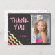 Cartão postal de agradecimento de aniversário com quadro-negro colorido para meninas. Cartão de agradecimento de aniversário fofo com uma foto e nota de agradecimento para seus amigos e familiares. Envie sua foto e personalize o cartão com o nome do seu filho. O cartão tem estrelas e ondas coloridas na frente e o verso em fundo cinza escuro. Ótimo como cartão de agradecimento para meninas.
