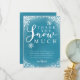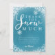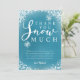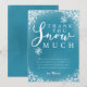 Modelo de cartão de agradecimento de festa de aniversário com tema de neve de inverno fofo em azul turquesa com neve e flocos de neve brancos brilhantes e uma fonte tipográfica que diz "obrigado muito neve". A mensagem editável agradece os convidados por virem à festa e pelo presente. Ótimo para o 1º aniversário de um menino na temporada de Natal.