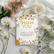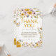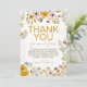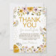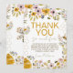 Envie um zunido de gratidão com este cartão de agradecimento correspondente "Doce Abelha Um". Apresentando a colmeia de aquarela assinada, abelhas e detalhes de favo de mel dourado. As ilustrações de flores silvestres brilhantes refletem a estética alegre do seu evento.