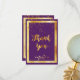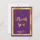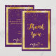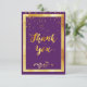 Um fundo roxo e uma moldura dourada falsa. Com uma chuva de confetes dourados. Na frente, uma fonte estilo letra manuscrita e o texto: Obrigado! e um enfeite floral dourado falso.