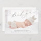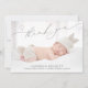 Elegantes notas de agradecimento de anúncio de nascimento de bebê doce apresentam sua foto favorita de recém-nascido na frente com um pequeno coração, a palavra "obrigado", o nome do bebê e estatísticas de nascimento. Seus nomes e uma mensagem de agradecimento em letras elegantes no verso.