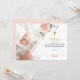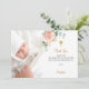 Um cartão de agradecimento de batismo moderno e elegante. Um fundo branco chic decorado com um floral cor-de-rosa água-marinha, dourado-rosado, folhagem de eucalipto e folhas de ouro falso. Personalize e adicione sua foto da criança, nota de agradecimento e nome.