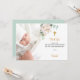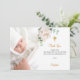Um cartão de agradecimento de batismo moderno e elegante. Um fundo branco chic decorado com uma peônia branca pintada à aguarela, floral, folhagem de eucalipto e folhas de ouro falso. Personalize e adicione a foto da criança, nota de agradecimento e nome.