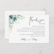 Cartão de agradecimento para celebração de casamento com floral azul empoeirado, fonte de texto minimalista e nomes em caligrafia.
