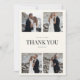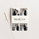 Expresse sua gratidão com um cartão de agradecimento de casamento lindamente elaborado que apresenta quatro fotos preciosas - duas na parte superior e duas na parte inferior, mostrando momentos memoráveis do seu dia especial. No centro, a frase "Obrigado" é elegantemente destacada em uma fonte preta deslumbrante, acompanhada pelos nomes do casal e a data do casamento. Este design combina perfeitamente toques pessoais com um toque de sofisticação, criando um precioso objeto que transmite sua apreciação com estilo e graça.