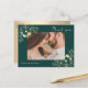 Celebre seu dia especial com este deslumbrante cartão de agradecimento de casamento vintage boêmio chic. Com tons elegantes de esmeralda, detalhes florais dourados e um belo espaço para foto na frente, este design luxuoso adiciona um toque de sofisticação à sua mensagem sincera. Personalize o verso com seu próprio texto para criar um souvenir memorável para seus convidados. Perfeito para um estilo de casamento atemporal e elegante.