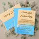 Convite de casamento moderno na costa com ondas azuis suaves e texturas de aquarela bege arenoso. Perfeito para casamentos na praia, cerimônias à beira-mar, casamentos de verão e celebrações de destino. Tipografia de roteiro elegante com estética romântica. Você pode personalizar substituindo a foto e os detalhes do seu casamento