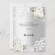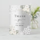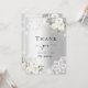 Um cartão de agradecimento de chá de noiva moderno e elegante. Um fundo com aparência prateada falsa. Decorado com rosas brancas, flores e renda. Na frente o texto: Obrigado, futura sra.