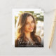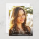 Cartão de agradecimento de formatura elegante e econômico com a foto do formando sobreposta com "obrigado" em um script branco elegante e o nome, escola e ano de turma em tipografia branca simples. No verso, personalize uma mensagem de agradecimento e adicione o nome do formando em um script semelhante a uma assinatura.