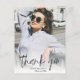 um design de cartão com sobreposição de foto com uma foto personalizada e texto em letra cursiva preta elegante. Sinta-se à vontade para personalizar a imagem e a mensagem de agradecimento no verso.