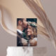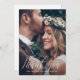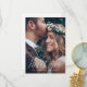 Cartão de agradecimento de foto de casamento com caligrafia elegante apresenta texto branco com uma foto e uma mensagem de agradecimento personalizada no verso do cartão.