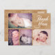 Fundo de madeira rústico e elegante com letras em escrita cursiva que dizem obrigado. Lindos cartões de agradecimento de bebê que contêm 4 fotos do seu novo bebê. Muito fácil de personalizar... basta clicar nas imagens miniaturas de amostra acima e à direita (projetadas para se ajustar melhor a 2 fotografias horizontais 6x4 e 2 fotos verticais 6x4), para seguir as instruções e procurar no disco rígido do seu próprio computador para encontrar sua própria foto/s.