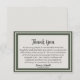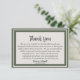 Uma maneira bonita de homenagear a vida de um ente querido é enviar cartões de agradecimento àqueles que compareceram ao serviço ou ajudaram você em seu momento de luto. Este cartão de agradecimento elegante e simples com uma borda verde clássica torna as coisas um pouco mais simples para você durante a temporada difícil. Use a mensagem de agradecimento já fornecida ou crie sua própria mensagem personalizada.