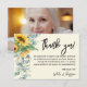 Cartão de nota de agradecimento de funeral de girassol com eucalipto em aquarela. Adicione sua foto e data favoritas.
