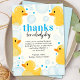 Para o menino que celebrou seu primeiro aniversário. Lindo cartão de agradecimento de aniversário "Pato Sortudo". Lindo cartão de agradecimento de aniversário com tema de patinho de borracha que pode ser personalizado com o nome do seu filho no topo do design e sua própria mensagem de agradecimento na parte inferior (sinta-se à vontade para usar a mensagem de design incluída e apenas inserir seus próprios nomes/detalhes). Para qualquer pedido personalizado ou solicitação de personalização, entre em contato conosco via Zazzle.